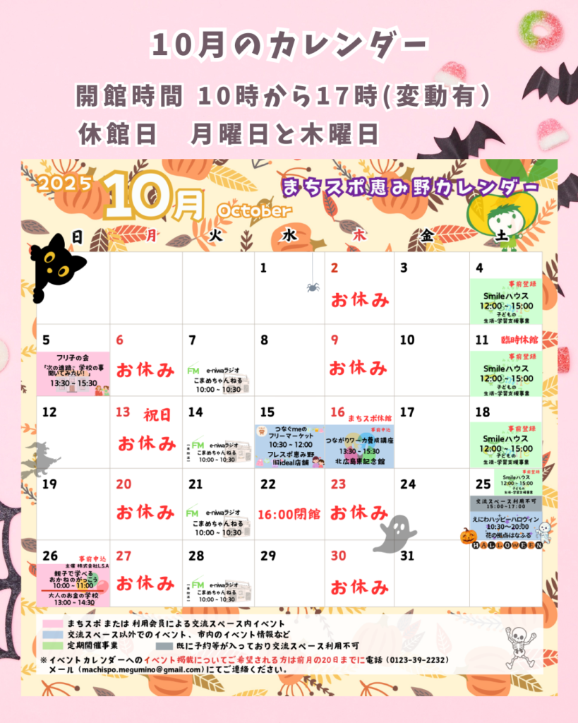まちスポ恵み野で開催するイベントや他、市内のイベント情報を発信しています!開館の状況については下のカレンダーをご覧ください。