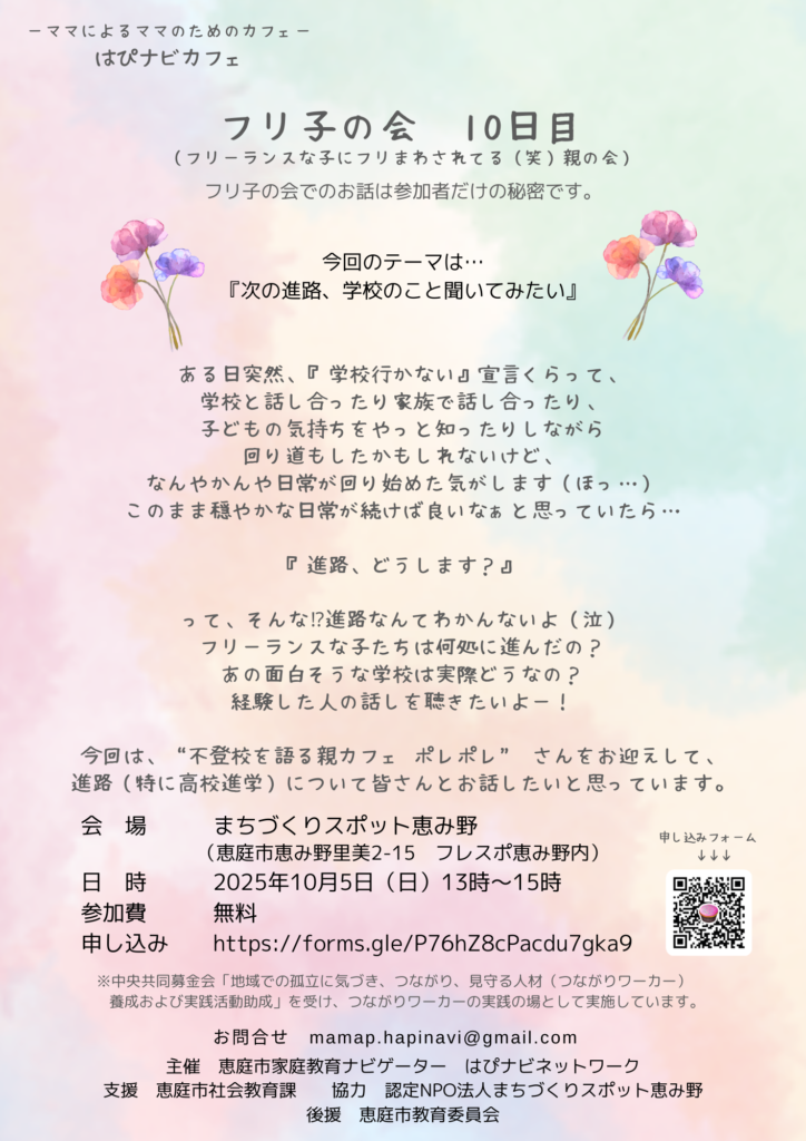 内容: 不登校の子を持つ親が集まり、悩みを共有したり意見交換をしあう場です。今回のテーマは「次の進路、学校のこと聞いてみたい」 ✨✨