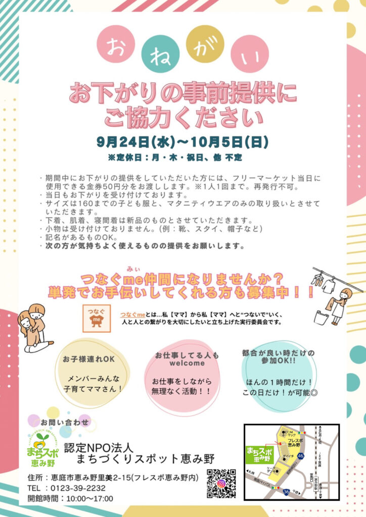 内容: つなぐme初の試みでフリーマーケットを開催します。お下がりの子ども服1枚50円から!