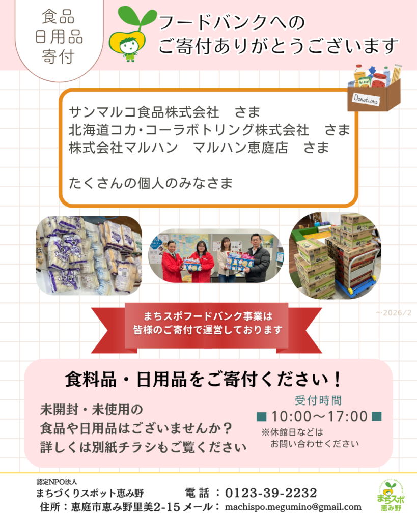 寄付いただいた食品、日用品は、まちスポ恵み野を通して必要なかたへお届けできるよう今後も努めてまいります。