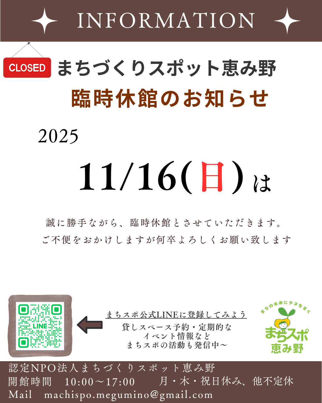 🕑まちスポ恵み野 臨時休館のお知らせ🕑