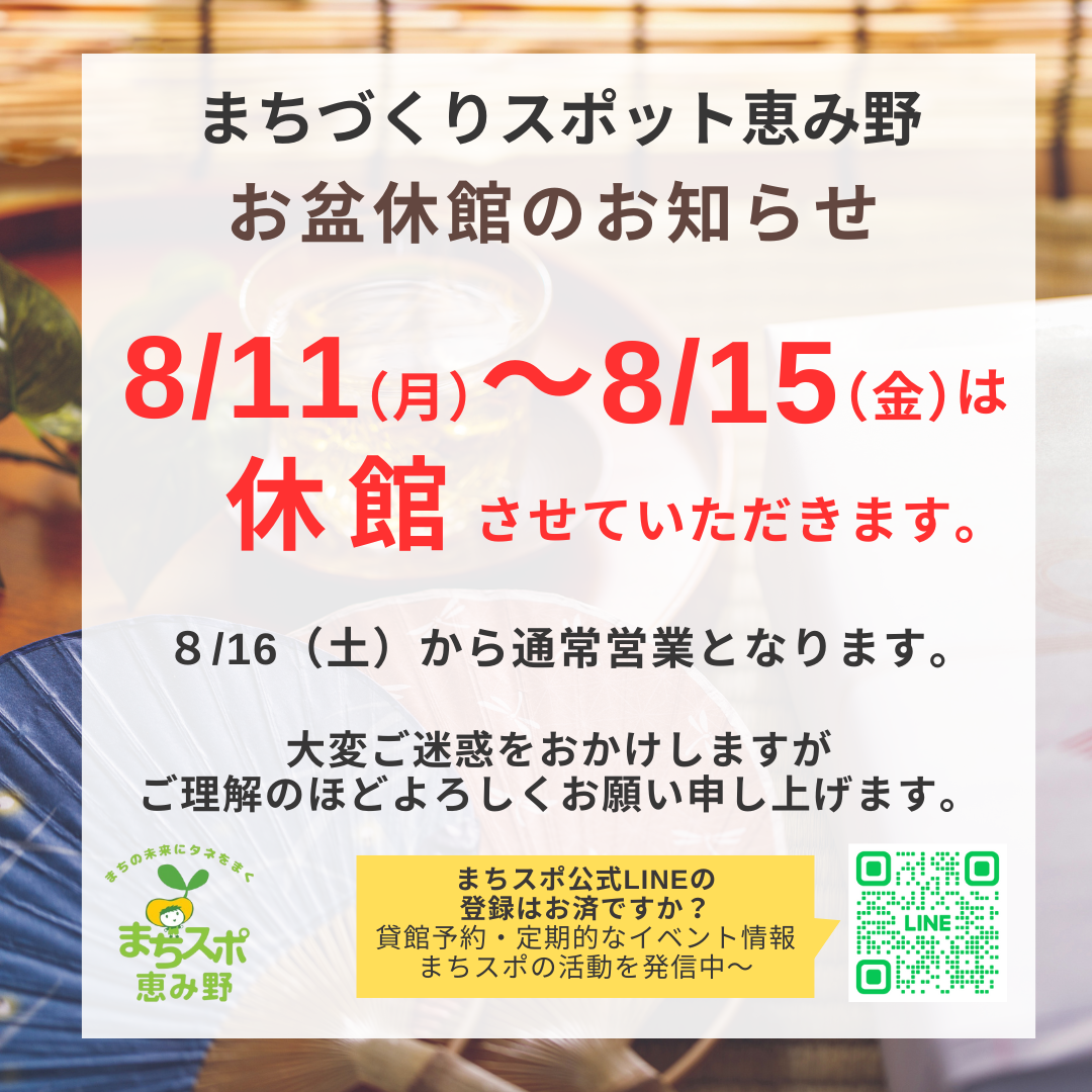 🕑 まちスポ恵み野 お盆休館のお知らせ 🕑